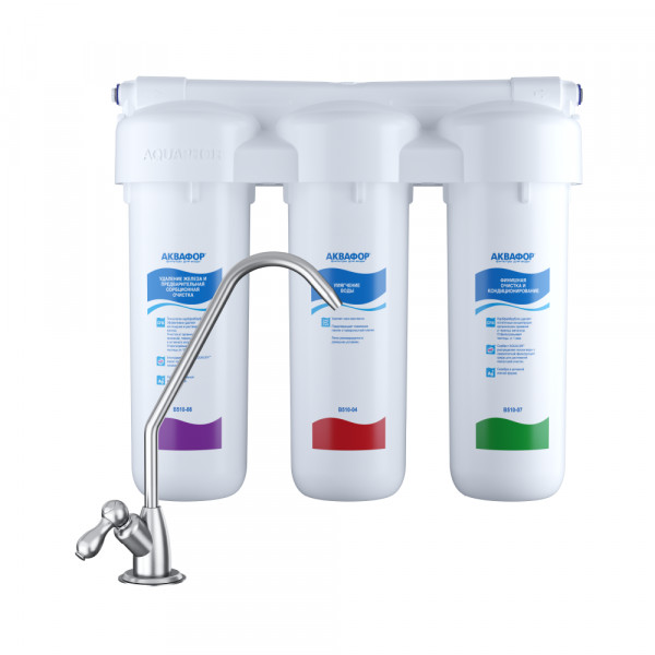 Обратноосмотические фильтры используются для абсолютной защиты от накипи, т.к. полностью устраняют соли жесткости из воды.нетЧисло ступеней очисткиКартриджи последовательно очищают воду и от видимых примесей, и от растворенных. Первый картридж задерживает более крупные частицы, а каждый последующий - более мелкие. Чем больше ступеней - тем лучше фильтр очистит воду: поймает более мелкие видимые частицы ржавчины, песка и ила, успеет захватить из воды максимум растворенных примесей - хлора, нитратов, тяжелых металлов и других.3МинерализацияПроисходит после финишной очистки воды. Необходима прежде всего в фильтре обратного осмоса, поскольку такой фильтр полностью устраняет из воды все примеси, в том числе минералы. Минералы добавляются в оптимальной концентрации - для пользы и привычного вкуса воды.нетПостфильтрацияФинальный этап очистки воды: картриджи постфильтрации удаляют самые мелкие механические частицы и кондиционируют воду, придавая ей более приятный вкус.нетНакопительная емкостьОбычно нужна в фильтрах обратного осмоса. Глубокая фильтрация требует времени. Чтобы Вам не приходилось ждать, пока вода наберется в чайник или кастрюлю, почти во всех моделях используется накопительный бак для чистой воды или другая емкость. В стандартном фильтре обратного осмоса под мойку воды в баке достаточно для семьи из 5-6 человек.нетФильтрующий модуль в комплектедаОтдельный крандаДавление в водопроводе не более, атмМаксимальное давление воды на входе в систему, при котором возможна стабильная работа фильтра.6,5Ширина, смОбратите внимание на габариты фильтра, и измерьте, сколько свободного пространства в предполагаемом месте установки.33,2Глубина, смОбратите внимание на габариты фильтра, и измерьте, сколько свободного пространства в предполагаемом месте установки.10,5Защита корпуса от гидроударовдаИсходная водаЖесткая вода – вода с избытком минеральных солей. От нее появляется накипь в чайнике, известковый налет на сантехнике и разводы на посуде. Мягкая вода – та, в которой мало минеральных солей. Нет накипи в чайнике и разводов на посуде. Фильтры для мутной воды и фильтры от ржавчины, как правило, имеют несколько стадий очистки и дополнительный полипропиленовый картридж. Он задерживает механические частицы ила, песка и ржавчины и защищает картриджи более глубокой очистки.жёсткаяУстраняет мутностьМутность водопроводной воды может говорить о том, что в ней много мелких механических частиц. Важно, чтобы в фильтре был установлен дополнительные картридж механической предфильтрации (полипропиленовый) - он продлит жизнь остальным картриджам более тонкой очистки.нетУстраняет ржавчину, бурый осадокЛюбой фильтр под мойку удалит из воды крупные и мелкие частицы ржавчины. Некоторые фильтры имеют повышенный ресурс по железу: они дольше служат в такой воде, поскольку лучше подходят для удаления из воды железа и механических частиц ржавчины.даЗащита от бактерийВсе проточные фильтры в той или иной степени защищают от бактерий. Например, добавление серебра препятствует их размножению. Это стандартная степень защиты. Если в семье есть дети, пожилые люди или аллергики, воду рекомендуется обеззараживать, то есть полностью удалять микроорганизмы. Повышенную защиту от бактерий дают фильтры с половолоконной мембраной. Это пучок тру