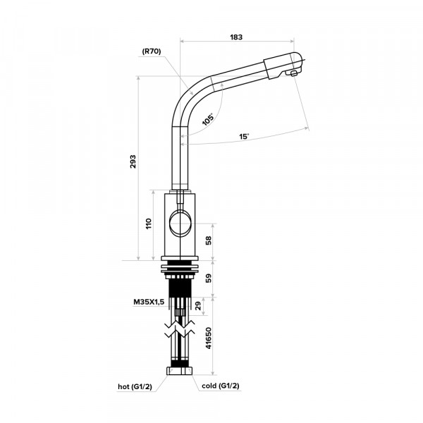 Смеситель снабжен гибкими шлангами для холодной, горячей и очищенной воды.
