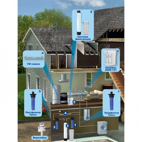 | Изначально вода прозрачная, при отстаивании желтеет. При кипячении выпадает белый осадок солей жесткости. | Очистка от растворенного железа до 10 мг/л, марганца и солей жесткости при незначительном содержании органических веществ. |
