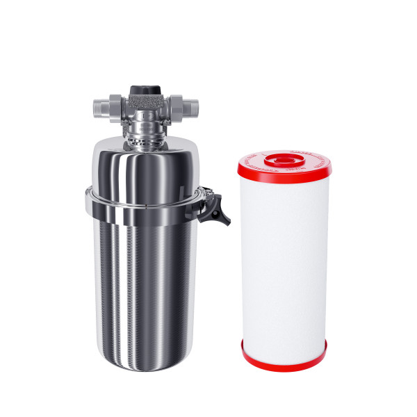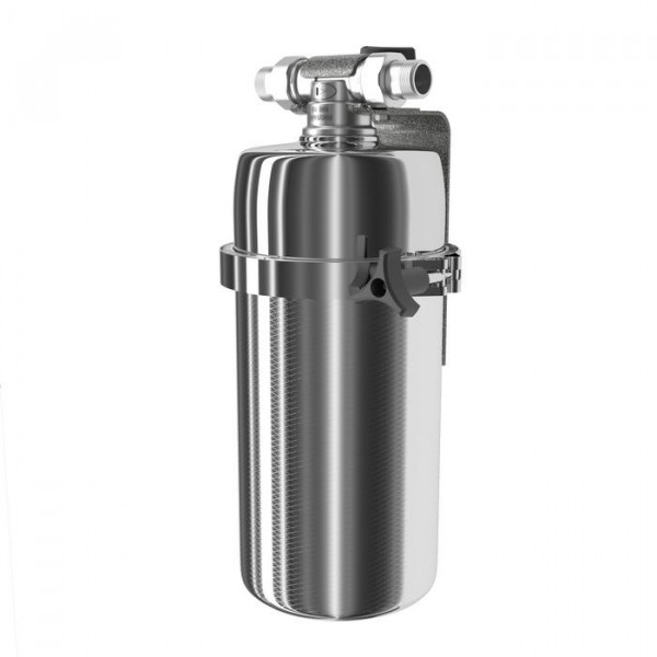 Магистральный фильтр среднего размера. Модель оснащена быстросъемным креплением «американка». Нижний полукорпус изготовлен из нержавеющей стали марки AISI 316, особенно устойчивой к коррозии и высоким температурам.
